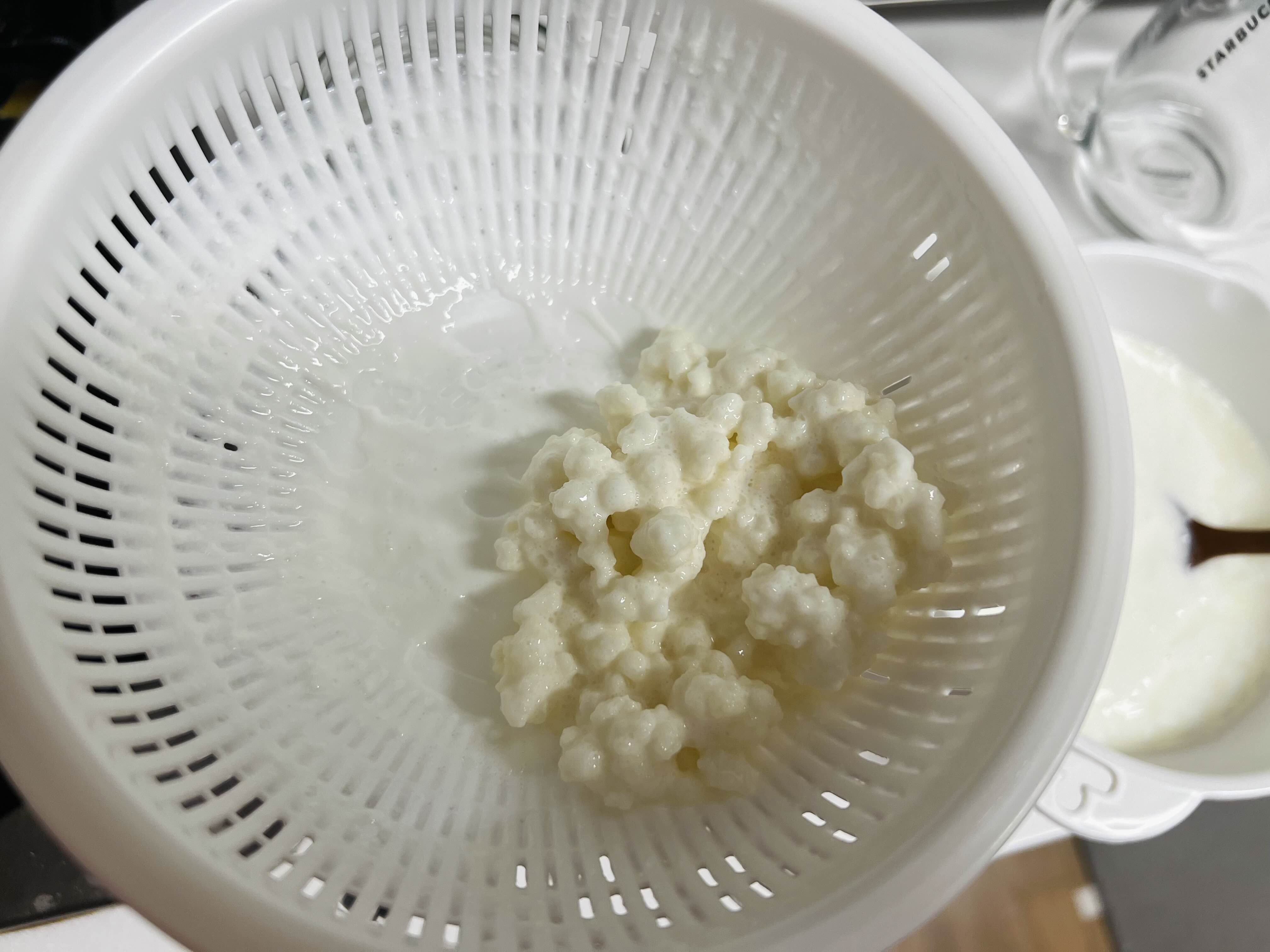 • 플라스틱 체에 부어 티벳버섯(알갱이)과 요구르트를 분리