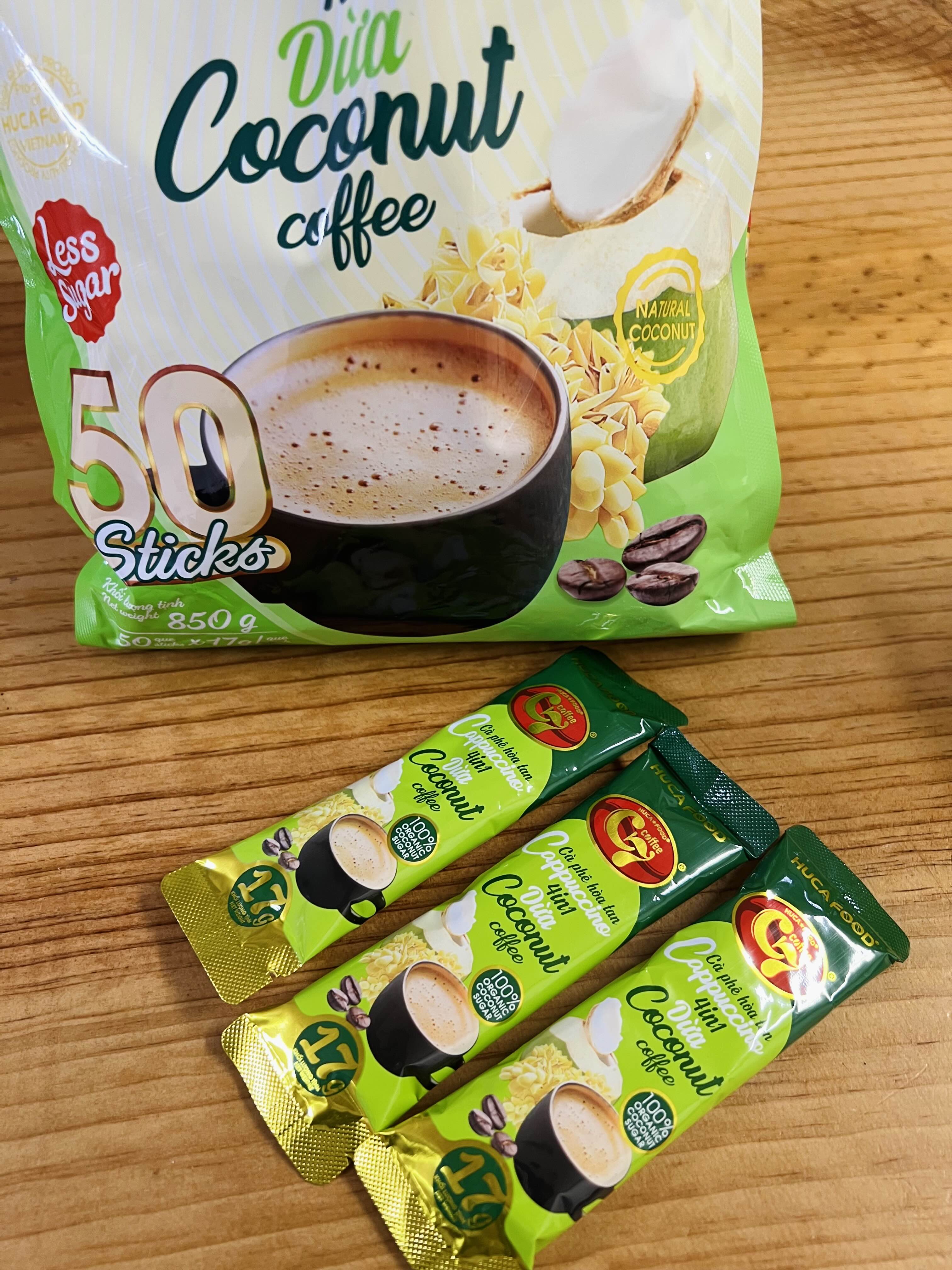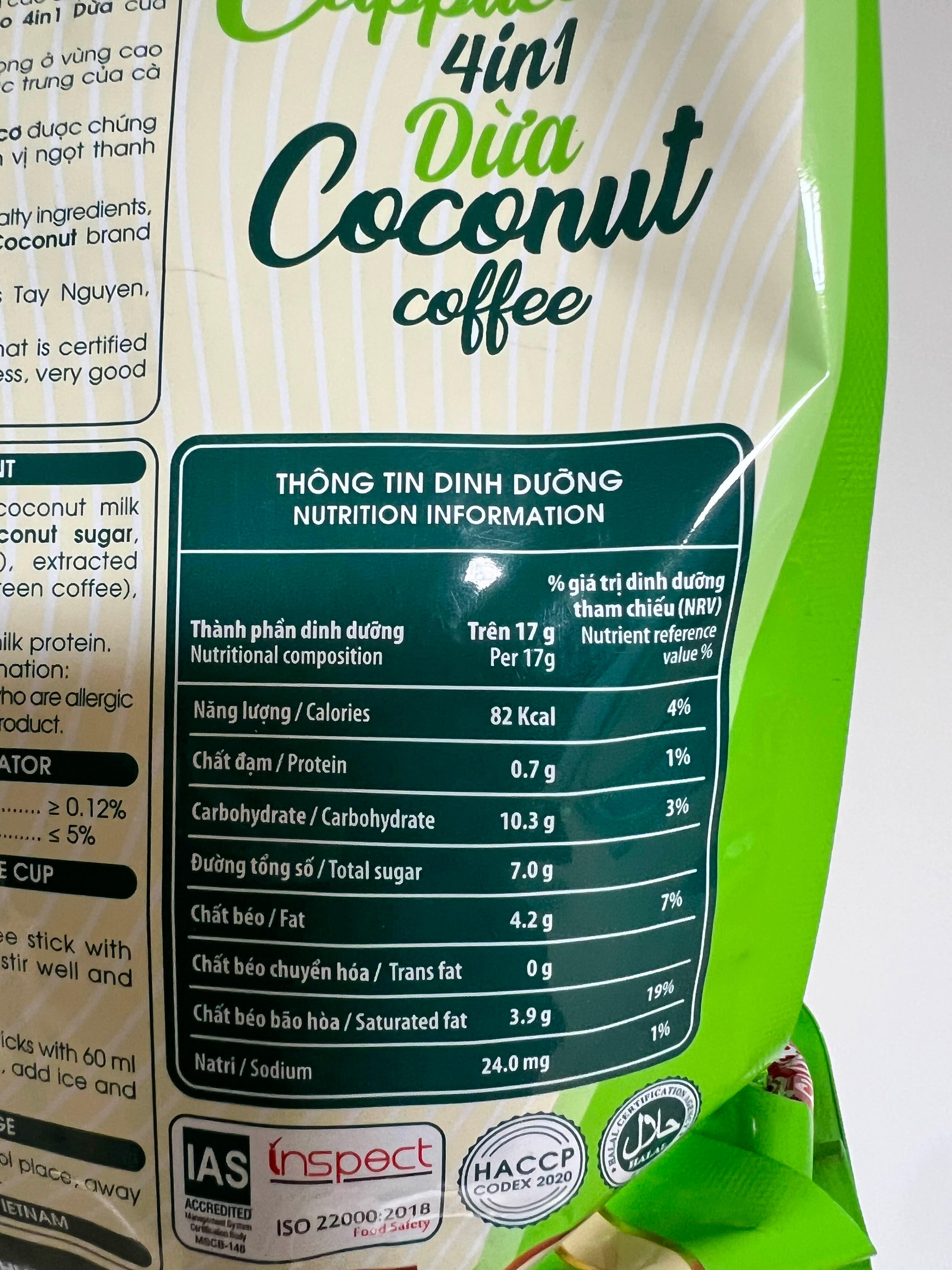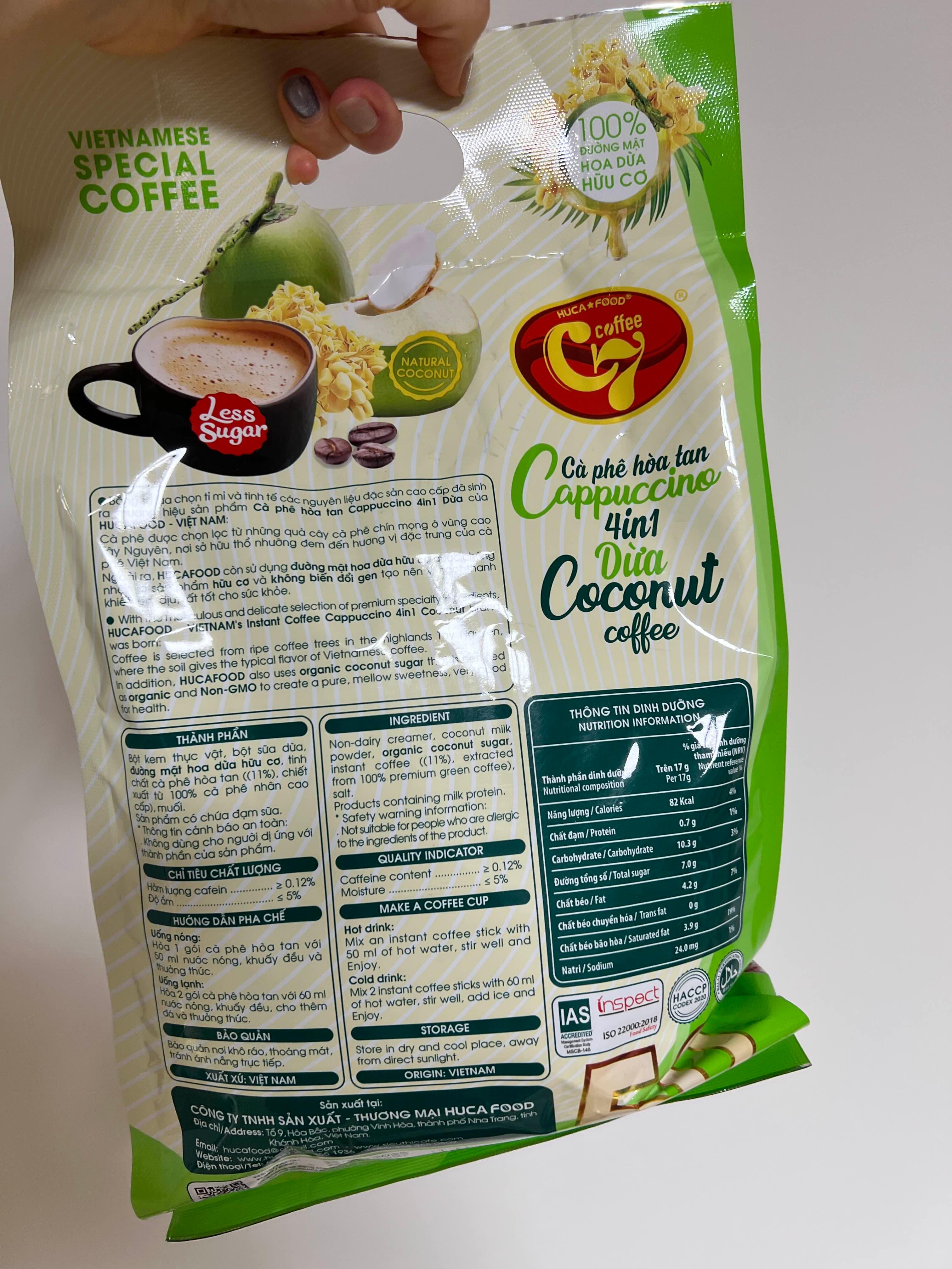 “100% 유기농 코코넛 슈가”, “Less Sugar”, “Vietnamese Special Coffee”